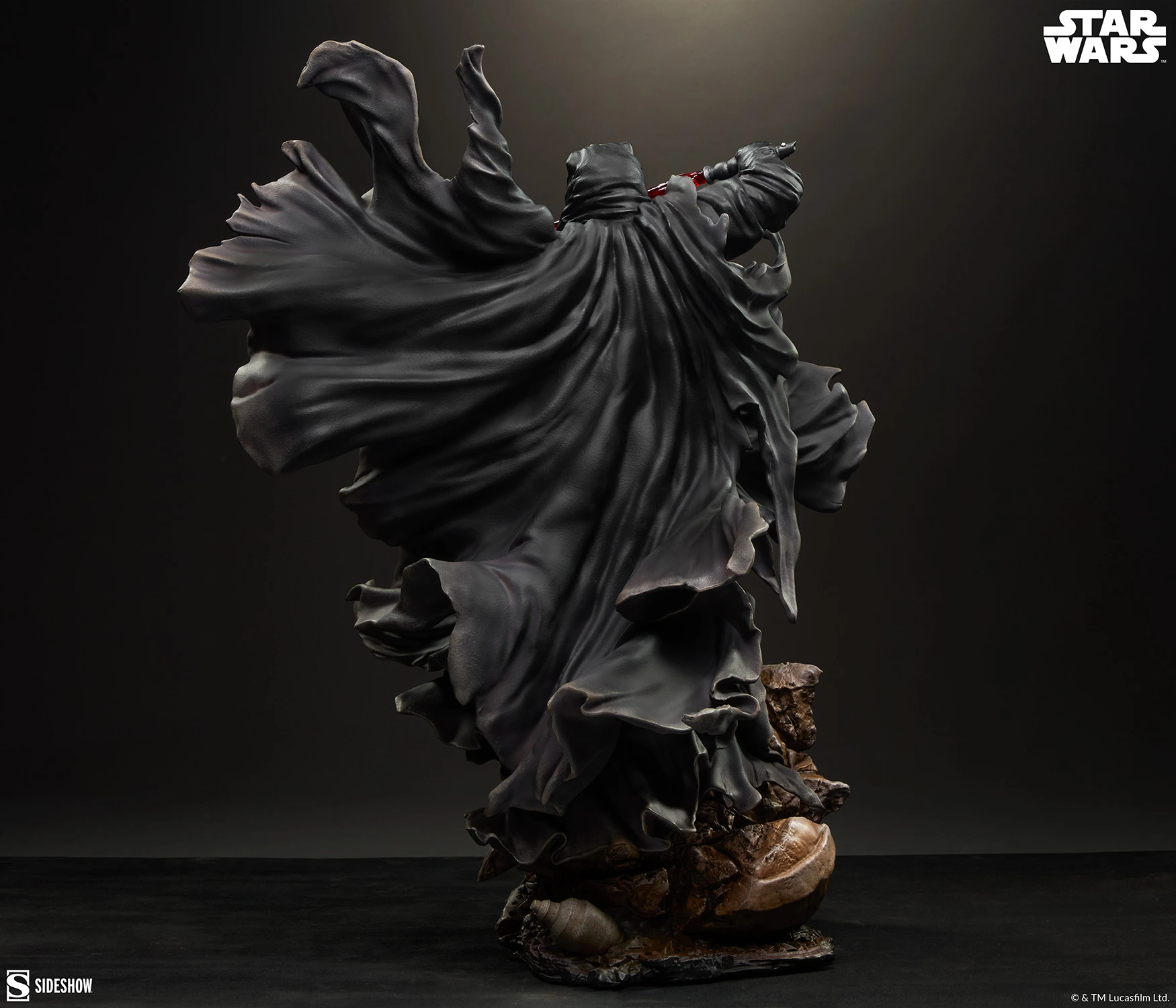 Con unas dimensiones de 53,3 cm de alto, 43,1 cm de ancho y 55,8 cm de profundidad, la estatua de Darth Nihilus™ es la grotesca encarnación del vacío insaciable. Con su oscura capa que lo envuelve por completo, Darth Nihilus emerge de una tumba fragmentada rodeada por un árido paisaje desértico. Las rocas rojas erosionadas adquieren el color óxido de la sangre seca al ser alcanzadas por el sable de luz de este despiadado villano. Absorbe la energía de la Fuerza de cada criatura en su afán por preservar su propia vida, tiñendo su corazón de un negro tan intenso como la túnica que viste.